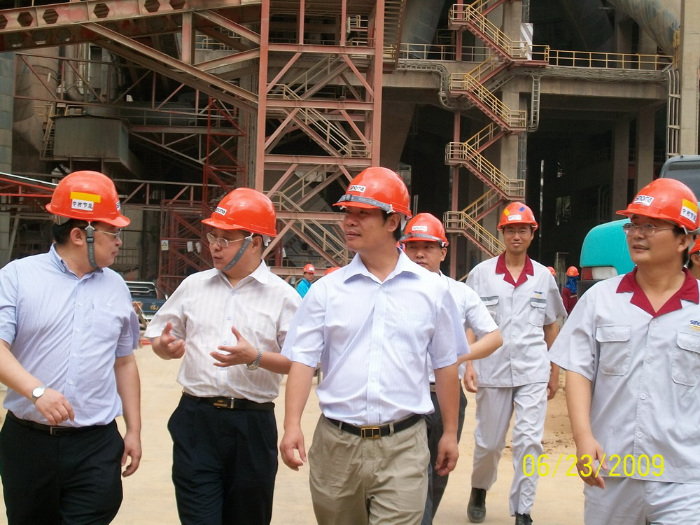 6月,何新平總經(jīng)理、魏文華副總經(jīng)理、董蘭起副總工程師等一行七人,也趕到京都項目現(xiàn)場檢查、指導(dǎo)工作。到現(xiàn)場后顧不上休息,換上安全鞋,戴上安全帽,風(fēng)塵仆仆視察了循環(huán)水冷卻塔、化學(xué)水處理室、汽輪發(fā)電機廠房、SP5鍋爐、AQC5鍋爐、AQC6鍋爐、SP6鍋爐等施工工地。何總對每個項目都仔細觀察,了解各個環(huán)節(jié)的關(guān)鍵點及存在問題,在SP5鍋爐看到所在位置錯綜復(fù)雜,水泥線的輸送從框架中間穿過,并且被水泥線的窯尾、生料磨房、生料輸送三面包圍,又由于和汽輪發(fā)電機廠房相距較近,根本沒有鍋爐鋼架制作場地。就明確指出SP5是京都項目工程中的關(guān)鍵點,加快土建施工速度是首要問題,決不能因為土建而貽誤工期。何總在現(xiàn)場與魏總、董總、王品副部長及京都項目吳蘇軍經(jīng)理商量后,當(dāng)場拍板:為了加快施工進度,將鋼筋混凝土框架改為鋼筋混凝土框架柱,平臺改為鋼結(jié)構(gòu)形式。對其它各點也進行了精辟地一一闡述……