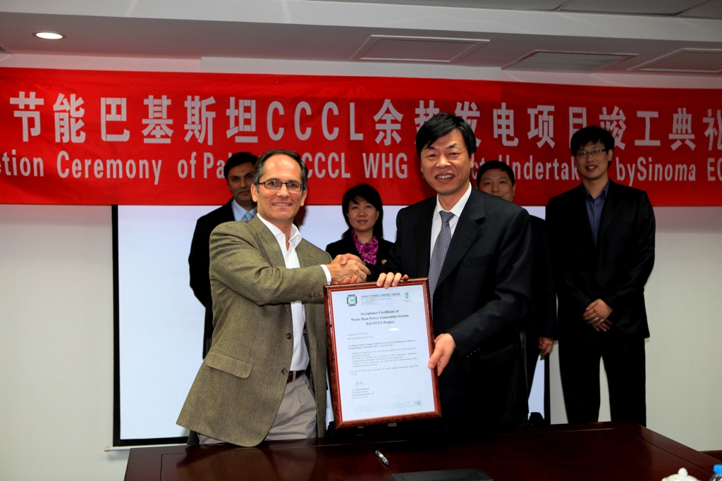 4月20日,中材節(jié)能發(fā)展有限公司董事長(zhǎng)張奇代表公司從巴基斯坦CHERAT水泥公司首席執(zhí)行官Azam先生手中接過(guò)了余熱電站工程最終接收證書(shū)(FAC)。