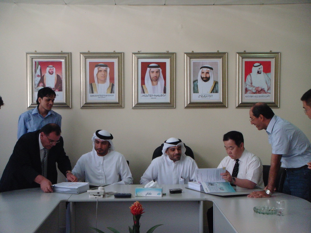中材節(jié)能市場(chǎng)部部長(zhǎng)王毅及市場(chǎng)經(jīng)理李浩、劉志斌、洪會(huì)林等與阿聯(lián)酋UCC水泥公司董事長(zhǎng)Mr.Rami、總經(jīng)理Mr.Yasir、生產(chǎn)廠長(zhǎng)Mr.Ibrahim、項(xiàng)目經(jīng)理Mr.Nasser及業(yè)主方咨詢顧問(wèn)共同見(jiàn)證了這個(gè)歷史時(shí)刻。