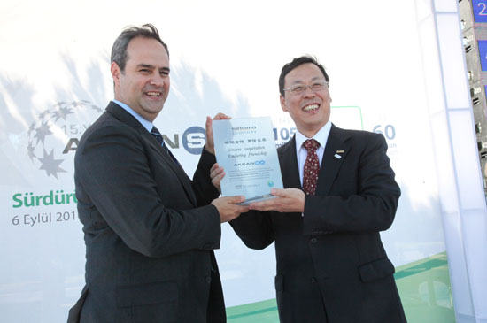 土耳其Akcansa水泥集團總經理(左)向中材節(jié)能總經理胡也明授牌
