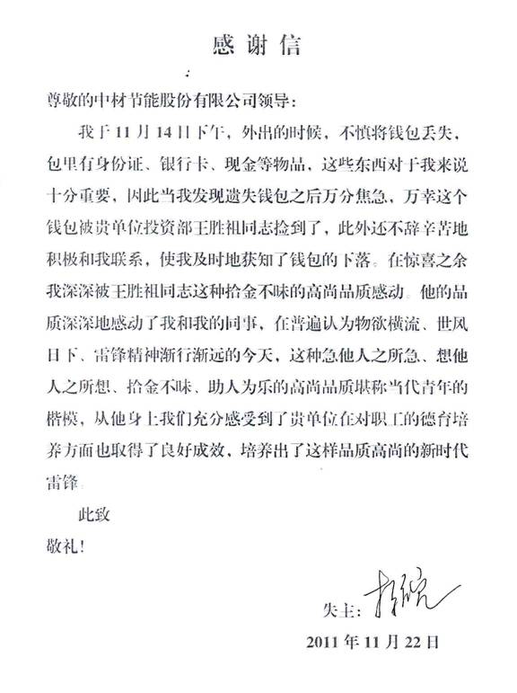 事后,王勝祖說:“當(dāng)我撿到錢包時,馬上想到失主現(xiàn)在肯定是心急如焚,我也曾經(jīng)丟過錢包,對于那種焦急的心情特別理解,我所能做的就是想辦法盡快與失主取得聯(lián)系,讓失主盡早放下焦慮與擔(dān)心”。李先生被王勝祖這種想他人所想、樂于助人的高尚品質(zhì)所感動,專門發(fā)來一封感謝信以表他的感激之情。