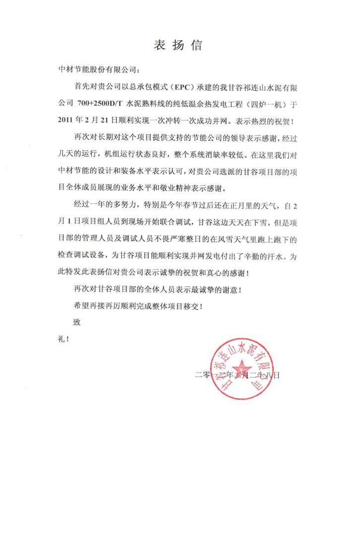二月的隴東大地依然白雪覆蓋,春寒料峭,當(dāng)人們還沉寢在歡度春節(jié)的喜悅時刻,我公司甘谷項目部的全體員工已經(jīng)們結(jié)束了短暫的休假,投入到了緊張的電站調(diào)試工作中。按照項目計劃和業(yè)主要求,2月5日2#線AQC鍋爐率先煮爐,隨后依次進行了2#線SP爐、1#線AQC爐、1#線SP爐煮爐工作,2月10日至20日電站各蒸汽管線完成了吹管清掃、熱控調(diào)試等工作。2月21日17點啟動機組沖轉(zhuǎn),在完成了機組短路,發(fā)電機升壓、同期檢查等一系列實驗后一次并網(wǎng)成功。到目前為止機組運行正常,機組的各項運行參數(shù)符合國家標(biāo)準(zhǔn)要求。為此,甘谷祁連山公司給我公司發(fā)來感謝信,對我公司甘谷項目部能夠克服各種困難,為業(yè)主所想,精心施工,鑄造精品項目的誠信和敬業(yè)精神表示感謝。